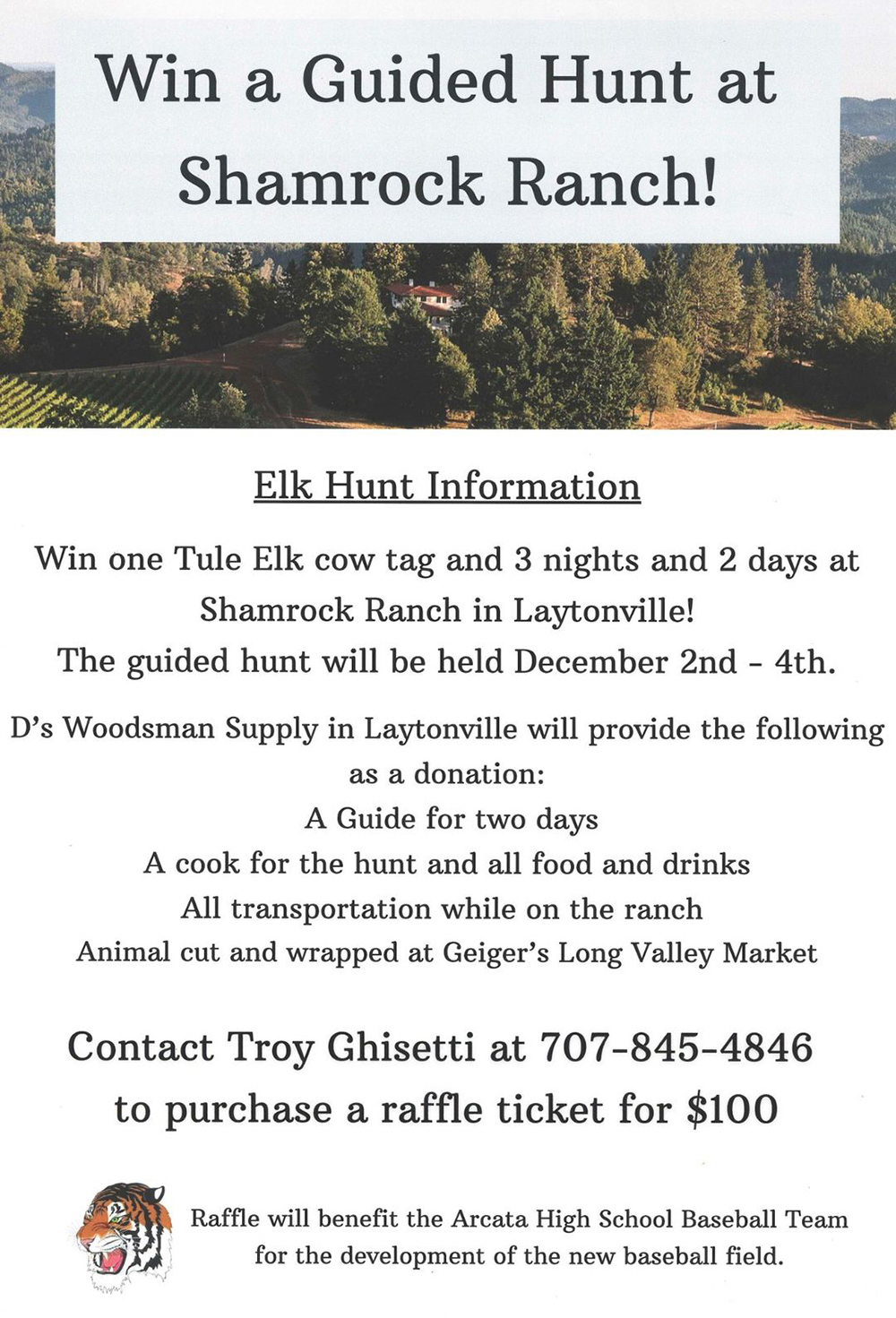 The Arcata High Baseball Fund is having a raffle for a guided hunt at Shamrock Ranch in Laytonville. You can purchase a raffle ticket for $100 and if you win, you'll get to do a 2 day guided hunt at Shamrock Ranch, Dec 2nd - 4th. The raffle will happen early November or when all tickets are sold. Please reply here if you'd like to buy a raffle ticket or contact Coach Troy Ghisetti. 100% of the money raised is being used to finalize Arcata High's new baseball field so the Tigers can host their 1st ever home games next spring. |